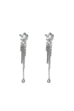 The Belen Earrings will effortlessly pair with your favourite looks. Rendered from silver hardware and embellished with silver diamantes. This style is suspended by a classic circle stud and finished with a teardrop style crystal. Featuring a clip-on back.