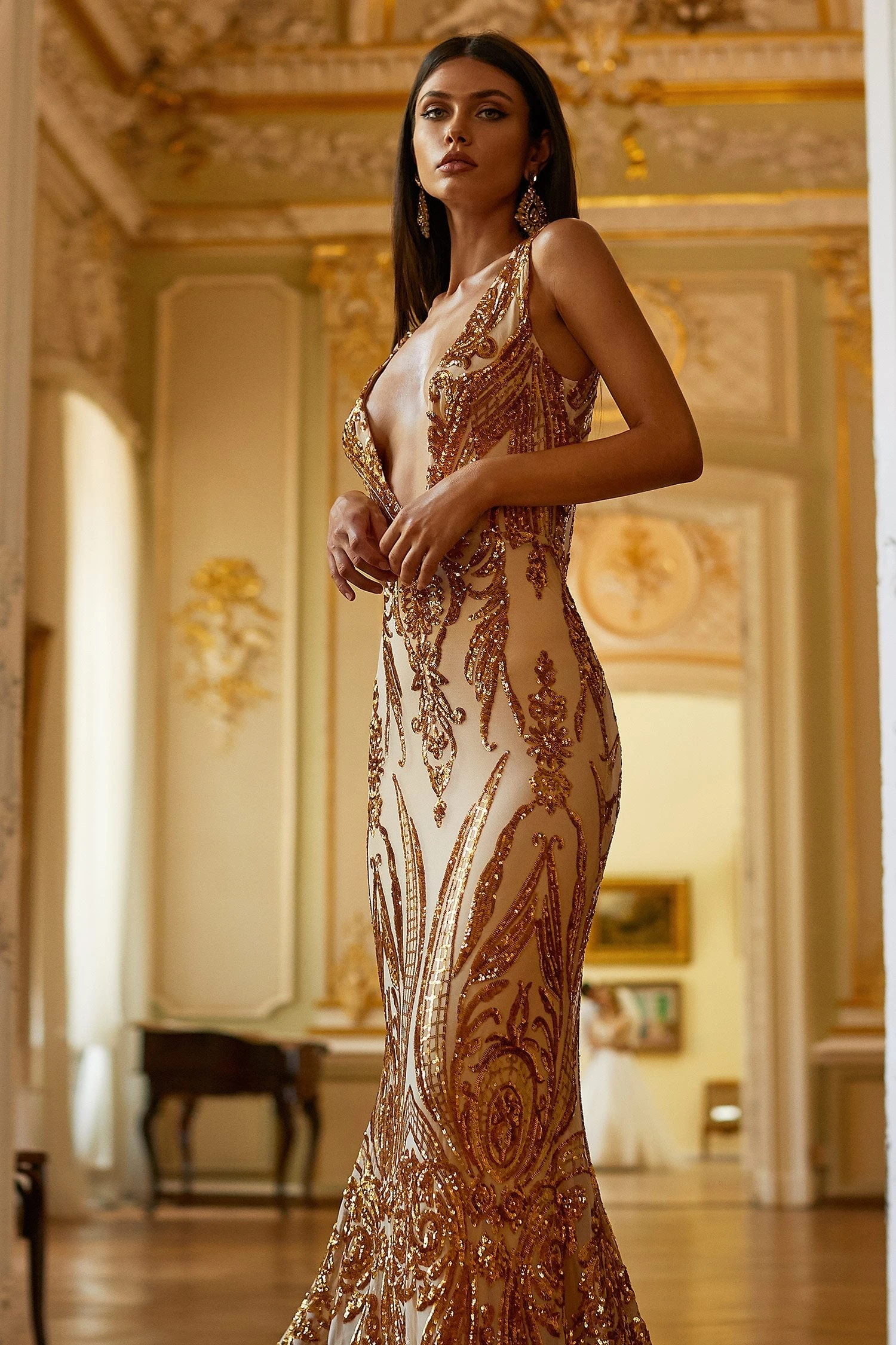 Stretchy sequin fabric, size down for a fitted look, no cups, non-adjustable straps, long train, deep plunge neckline.